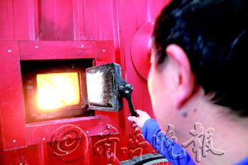 | 工作人员透过观察口观察炉内燃烧情况。 本报记者 刘涛 摄 |