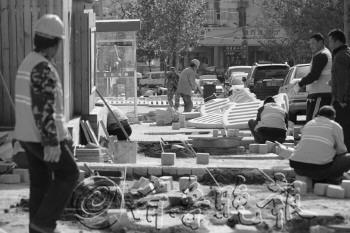18日,在浙江路上,工人正在铺设石砖。为了不影响游客游玩,施工部门趁旅游淡季整修天主教堂周边路面,整修后将保持原有风貌,预计半个月左右完工。