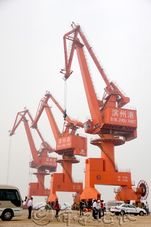 | 滨州港门座式起重机静待货船靠岸卸货。 |
