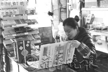 在济南山大路上的一家酒水店里,店主正在阅读免费订阅的《齐鲁晚报》。