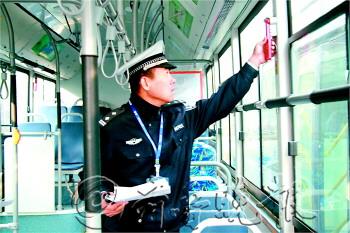 | ◥济南公交今年第一批采购的215辆清洁能源公交车已陆续到位,图为市车辆管理所查验科郭警官正在对新车进行查验。 通讯员 赵东云 摄 |