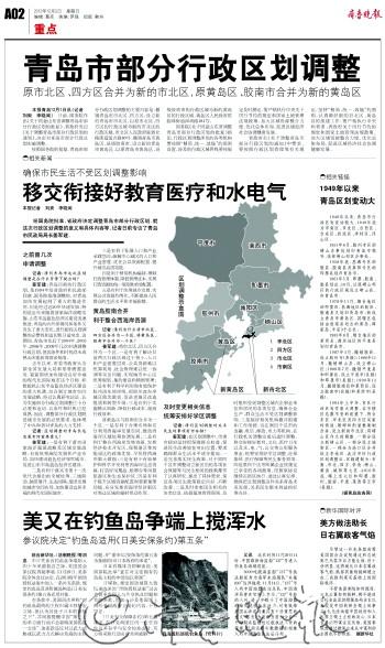 本报记者 曹思扬 2012年12月,根据国务院批复、省政府通知,青岛部分行政区划进行了调整,新市北、新黄岛亮相。 按照国务院批复,青岛部分行政区划调整的主要内容是:撤销青岛市市北区、四方区,设立新的青岛市市北区,以原市北区、四方区的行政区域为新的市北区的行政区域。撤销青岛市黄岛区、县级胶南市,设立新的青岛市黄岛区,以原青岛市黄岛区、县级胶南市的行政区域为新的黄岛区的行政区域。 据介绍,青岛目前的行政区划是1994年经省政府和民政部同意、国务院批准调整的,1949年以来,青岛市行政区划曾历经几次较大变动。经过近20年快速发展,特别是近年来随着国家海洋战略实施、山东半岛蓝色经济区建设迅速推进,青岛的内外部情况和条件又发生了重大变化,进行新的区划调整的必要性和迫切性日益突出,调整部分行政区划是城市发展的必然要求。 相关链接 1949年以来,青岛市行政区划历经的较大变动 1949年底为市南区、市北区、台西区、台东区、四沧区、李村区、浮山区。 1951年6月,胶州专区的崂山办事处划归青岛市领导,改称崂山郊区办事处。 1958年底,昌潍专区的胶县、胶南县及莱阳专区的即墨县划归青岛市。 1961年5月,即墨、胶南、胶县划出;10月,以原崂山郊区的行政区域设立崂山县,归青岛市。 1978年11月,烟台地区的即墨县,昌潍地区的胶县、胶南县又划归青岛市;新设立青岛市黄岛区,其辖区包括由胶南县划出的黄岛、薛家岛、辛安3个公社。 1983年8月,烟台地区的莱西县、潍坊地区的平度县划归青岛市。 1987年4月,撤销胶县,设立胶州市(县级);1988年11月,撤销崂山县,设立崂山区;1989年7月,撤销平度县和即墨县,设立平度市(县级)和即墨市(县级);1990年12月,撤销胶南县和莱西县,设立胶南市(县级)和莱西市(县级)。 1994年上半年,市区行政区划作重大调整,在市辖区总数不变的前提下,将台东区、市北区及四方区吴家村街道、错埠岭街道整建制合并,设立新的市北区;将崂山区作大的调整,一部分设立新崂山区,一部分设立城阳区,一部分与沧口区合并设立李沧区。此次市区行政区划调整后,区级建制为:市南、市北、四方、李沧、崂山、黄岛、城阳等七区。2010年底,辖上述七区和即墨、胶州、胶南、平度、莱西等五市(县级)。