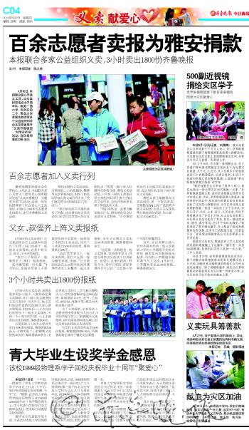 文/片 本报记者 陈之焕 今年,本报联合爱心天使义工团、青岛大学、天山小学、市南实验二小、青翼支教团等数十个单位先后展开数十场义卖活动,每一场活动都得到读者大力支持。所筹善款用于捐助需要帮助的人们。 4月30日,本报联合爱心天使义工团、公交集团宏达巴士21路车队、莱芜一路小学、市南实验二小、青岛大学青翼支教团等多个公益组织的百余名志愿者展开“义卖齐鲁晚报为雅安祈福”活动,当日筹得善款2358.50元,全部捐给雅安灾区。 今年暑假前,青岛大学青翼支教团计划暑期到贵州省安顺市关岭县板贵乡田坝小学支教。6月16日,60余名志愿者报名参加本报义卖活动,帮助青翼支教团筹集支教资金,为贵州省安顺市关岭县板贵乡田坝小学筹集善款,购买学习用品。当天共卖出1500份报纸,筹集善款2819.7元,志愿者们的支教活动获得市民的大力支持。 敦化路的赵文静赵雅静姐妹俩自幼身患“运动元神经损伤”,浑身软绵无力,三度因患肺炎而生命垂危,却一直坚持学习。姐妹俩在今年的ATC英语大赛青岛赛区荣获特别金奖的好成绩,但却因路费问题准备放弃比赛。得知这一情况后,本报联合爱心天使义工团为她们组织义卖活动,7月7日共义卖齐鲁晚报1200份,为姐妹俩筹集路费2637.9元。 一次次的义卖让本报的爱心理念得到传播,更感动了许多人加入,从3岁的娃娃到70多岁的老人,纷纷踊跃参与本报的爱心义卖活动。本报将继续组织爱心义卖,传播正能量,让爱心与正义走得更远。