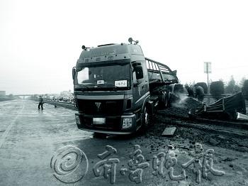 本报11月25日讯(记者 周衍鹏 通讯员 张晓东 潘龙 杜诚) 25日,在青银高速上,一辆运载煤块的斯太尔车与一辆载有建材的解放车发生碰撞,10吨煤块倾撒到路上,造成银川方向交通暂时中断。经过快速处置,一小时后,高速公路恢复通车。 25日13时许,110指挥中心接警称,青银高速发生两货车相撞事故,造成严重路堵。接到报警后,青银高速青岛路政、交警人员立即赶到现场,按照程序摆放了安全警示标志,指派人员在后面疏导交通,安抚后面堵塞的司机。现场经了解得知,事故发生时,来自河北邯郸的牛先生驾驶一辆斯太尔货车来青岛拉煤,返回途中行驶至34公里处时,车厢被一辆河北牌照的解放货车追尾碰撞,牛先生情急之下向左急打方向盘躲避,结果斯太尔车直接冲上中央护栏,车头冲到青岛方向。车厢被撞烂后,所拉的20吨煤块有近多半撒落,造成银川方向交通堵塞。所幸事故没有造成人员受伤。 由于事故撞击力量较大,斯太尔车车厢已经严重破损,于是路政人员调集大型清障车先将“惹祸”的解放车拖走,清出一个车道确保后面的车辆通行,随后调集平板货车和十余名应急救援人员对现场撒落的煤块进行倒货处置,将现场清理干净后,随后将骑在中央护栏上的斯太尔车拖离事故现场。下午14时左右,事故处置完毕,道路恢复畅通。