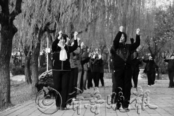 11月26日,在植物园内,几十位中老年市民聚集在一起跳“僵尸舞”,锻炼身体。据现场市民介绍,“僵尸舞”已成为时下最热的舞蹈,越来越多的市民加入到锻炼队伍中。            本报记者 王小会 摄