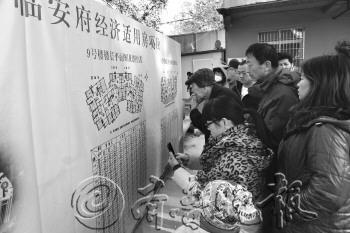 | 27日,在市北区一处经济适用房项目申购现场,市民正在观看项目信息。 |  | 27日,一名市民正在申购现场填表登记。 |