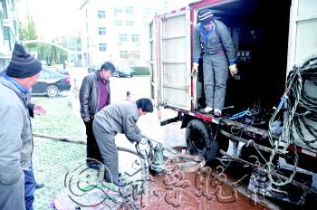 图为工作人员把管道内排出的水抽完后,再检修。