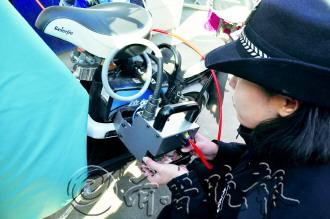 为规范对电动车的管理,解决电动车被盗之后难以查找、公安机关查获赃车之后难以返还等诸多问题,枣庄市公安局决定免费为电动车提供打码登记服务。图为28日,市中民警在给电动车打码。 本报记者 袁鹏 摄影报道