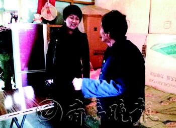 | 韩春凤(左)给任丙霞一家送来了崭新的折叠饭桌。本报记者 孔令茹 摄 |