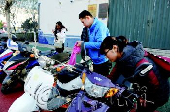 | 丢失的车辆被找回,市民仔细地擦拭起来。 本报记者 侯艳艳 摄 |
