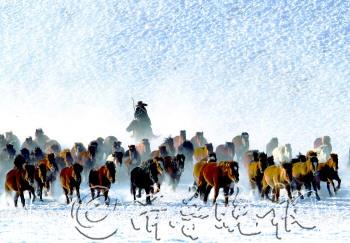 点评:拍摄地当时是零下三十几度,作者自驾到了那里,拍摄到草原牧民牧马归来瞬间的镜头。这幅图片最大特点是画面特别干净,群马奔腾的动感强烈。最为难得的是,这群马朝着镜头奔过来,让人有身临其境之感。