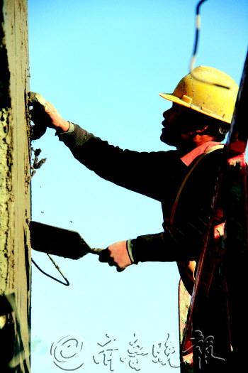 ◥“悬”在半空中抹灰。
