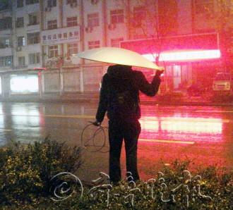 时间:2013年11月23日 自述:晚上天降小雨,这位买卫星天线的男子没带雨具,他将天线顶在头上站在路边等车。 点评:成为夜幕中一道幽默的风景。
