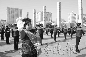 2日上午,威海交警支队在威海幸福门广场组织交通安全日宣传活动。“文明交通形象大使”王晓青带领60名社区阿姨跳起了自编的《出行安全广场舞》,舞蹈中融会了大量交警指挥手势。