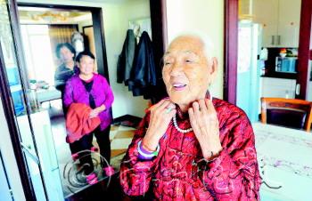 文/片 本报记者 邱志强 喜欢穿漂亮衣服、爱佩戴珍珠玛瑙首饰、出门前要花时间打扮一番……这可不是二十来岁的大姑娘,而是住在青岛市市北区鲁信长春花园的于显华老人。 于显华老人是土生土长的青岛人,现在和女儿住在一起,看到记者的相机,老人有些不好意思地说,“让你跑这么远来给我们家照相,真辛苦你了。”然后就起身去换衣服。十分钟后,老人戴着自己最心爱的项链,满面笑容地出现在大家面前。孩子们都开玩笑说,“这样一打扮,仿佛又年轻了二十岁。”老人听后开心地笑着,还自嘲道:“老了老了,不比年轻时候了。” 每天起床后,于显华自己收拾床铺、打扫房间,她不允许孩子们插手帮忙。收拾妥当后,就开始认真梳洗,老人端坐的姿态、梳头的动作,一招一式尽显大家闺秀风采。老人的孩子们说,母亲年轻时就很漂亮,在当地是出了名的美女。 洗漱完毕出门前,于显华还要认真整理服装和发型。整齐梳向脑后的齐耳银丝,干净的面庞,白齿红唇。虽然年近百岁,但举手投足间仍掩盖不住她端庄的气质。女儿们说在小区里,附近的老人都知道老母亲爱美,“我妈每次出门遇到熟人,大家都会夸她打扮得很漂亮,她听了以后就格外高兴。” 现在每逢年节,儿孙都从外地回到老家团聚,孩子们都会给老人带来各种礼物。而老人最喜欢的就是各种漂亮的衣服,每个孩子家里都存有几件老人喜欢的衣服。 老人的女儿们说:“和同龄人比起来,老母亲更爱美,更注重生活质量,这可能也是她健康长寿的最大原因吧。”