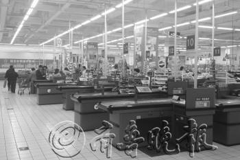 | 4日,在沃尔玛城阳分店内,超市收银台多数已暂停使用。