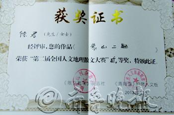 另外,经2013年中国旅游散文创作高峰论坛专家评审委员会评定,徐君同时获评“中国旅游散文创作实力作家”称号。