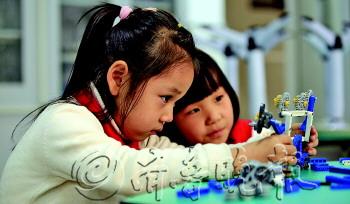 奥龙小学机器人课堂上孩子们在制作机器人。