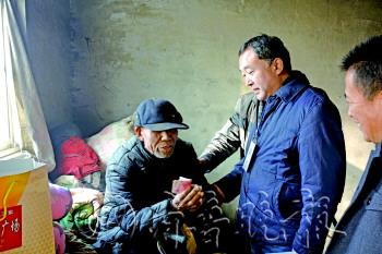 近日,由本报发起的“寒冬送暖”活动得到济阳热心人士的积极响应。2日,本报联合济阳县爱心志愿协会,将“温暖列车”开进大马家村与梁家村,为贫困户送上了一份温暖。图为济阳县爱心志愿协会会长赵志峰给74岁的李克业老人送上500元爱心款。