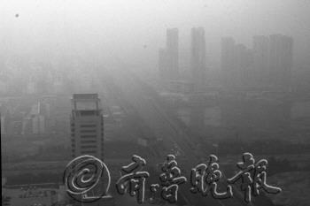 | 5日,新市区的高楼大厦伫立在一片朦胧之中。 本报记者 刘涛 摄 |