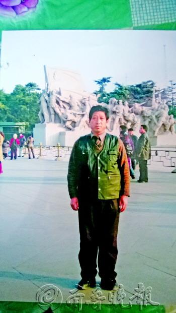 9日下午,在宁阳县鹤山乡山后村的公路上,张海燕手抚父亲张兴雷遗留在路面上干涸的血迹,跪地痛哭。5日晚,张兴雷面对着驶来的皮卡车将邻居推开,自己被撞身亡。小图为张兴雷在北京旅游时拍摄的照片。 本报记者 杜洪雷 摄