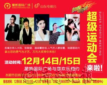 《超级运动会》 牵手星凯明星与你同登卫视 万元大奖等你来抢 作为山东卫视综艺频道的招牌体育娱乐节目,一直以来《超级运动会》拥有超高的人气与优良的收视率。在岁末寒冬,一场热力四射的《超级运动会》即将于本月14日和15日在星凯国际广场与德州人“面对面”。《超级运动会》是在有限的空间内通过新颖的环节设置,将趣味运动与才艺表演结合在一起的大众化娱乐竞技活动。本月14日、15日的《超级运动会》邀请了名嘴主持大凯、张敏健、温晓菁、刘思谨,人气艺人穆俊霞、姚蓉蓉等现场助阵,为您带来重重惊喜。同时,《超级运动会》还准备了高达万元的震撼大奖,为参加活动的朋友加油鼓劲! 本次活动现场将进行节目录制,录制后的节目定于12月21日中午12点于山东卫视综合频道播出。有意参加的市民朋友可拨打0531-68690001进行报名。