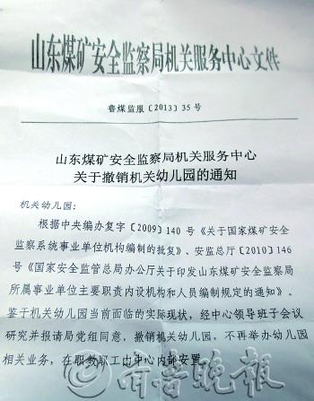| ▲10日上午,得知幼儿园要关门,部分家长站在门口,显得很无奈和不舍。 |  | ▲幼儿园主管单位山东煤矿监察局机关服务中心下发的文件,准备撤销幼儿园。 |