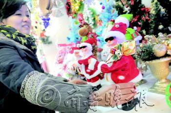 10日,在三站小商品批发市场,一位服务员正在店里忙着摆放圣诞物品。据服务员介绍,每年圣诞节都会提前一个月进货,现在正是圣诞饰品卖得最火的时间,到了圣诞节当天下午,这些饰品将统一摘下换上元旦饰品。