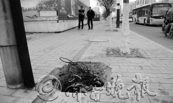 10日,在潍坊市胜利街与安顺路路口西南角,行人经过一处没有井盖的窨井。记者看到人行道上的窨井没有井盖,还有很多的电线盘在井口,过往的行人如果不注意就容易发生危险。