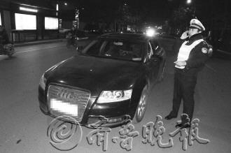 | 这辆奥迪车压在东西两条车道之间,终于被交警拦下。