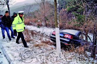 11日早,市区多有降雪。早7点许,在交警五大队辖区、201省道五家疃路段发生一起车辆相撞事故,一辆轿车被撞进路边沟中。据查,事故系一面包车在结冰路边侧滑,撞上轿车所致。事故没有人受伤。