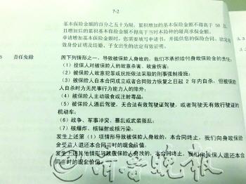 | 12月13日,民众从聊城市一家保险公司走出来。 本报记者 孟凡萧 摄 |  | 不少保险公司对合同文本中的免责条款特意做了加粗处理。 本报记者 孟凡萧 翻拍 |