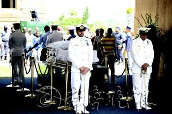 | 曼德拉住所。 |  | 6日,民众自发悼念曼德拉。 |  | 11日,民众在总统府外排队等待瞻仰曼德拉遗容。 |  | |  | |  | 14日,曼德拉灵柩登机运往姆塔塔机场。 |  | ▲13日,在位于南非约翰内斯堡的索韦托,游客在曼德拉故居前合影。 |  | 10日,多国政要参加追悼大会。 |  | ◥10日,FNB体育场追悼大会现场。 |  | 左图:11日,曼德拉灵柩离开第一军事医院。 |  | 右图:11日,曼德拉灵柩穿过比勒陀利亚街道。 |  | |  | 罗本岛监狱,曼德拉在此被监禁长达27年。 |  | |  | 15日,在古努村,曼德拉的灵柩安放在葬礼仪式现场。
