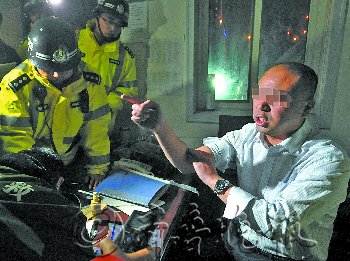 | 被查到涉嫌酒驾的男子吹气检测了八九次都不符合要求,执行公务的交警绷着嘴替他着急“使劲”。 本报记者 张中 摄 |  | 在医院抽血时该男子仍振振有词,强调自己不喜欢喝酒,也支持查酒驾,但自己喝酒实在是没有办法,但他忘了没人不让喝酒,喝酒也不违法,但酒后驾车就违法。