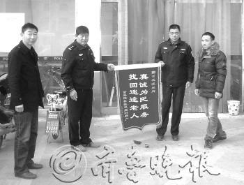 本报曹县12月15日讯(记者 李贺 通讯员 董西德) 12日,家住曹县侯集镇的郜先生一大早就来到曹县公安局曹城派出所,将一面写有“真诚为民服务 找回迷途老人”字样的锦旗送到民警手中,以此感谢曹县民警对走失七旬父亲的相救之恩。 12月5日13时,曹县公安局曹城派出所民警接到群众报警称:在曹县曹城办事处湘江路五完小附近发现一名老人躺在路边,不省人事,言语不清,身体发僵,请求出警。接警后,曹县公安局曹城派出所民警迅速赶到现场,发现一名70多岁的老人,由于天气寒冷,冻得直打哆嗦。民警逐上前耐心询问老人的情况,老人语言表达不清。民警看一时无法弄清老人的住址,就将老人抬上警车,带回所里。 到派出所后,民警把老人安置在警务室,并打开空调给老人取暖,还给老人端来了热水热饭。老人慢慢地恢复了意识,经耐心地对老人进行询问,老人提供了家在侯集的线索,具体如何来到了县城,老人一概不知。 派出所民警迅速和侯集派出所取得联系,在侯集派出所的帮助下,终于联系到了老人的家人,得知老人叫郜林海,今年74岁,侯集镇人,因外出不慎迷失方向。而后,曹城派出所民警迅速开车将老人送至家中。其家人看到老人安然无恙被送回了家,激动得热泪盈眶,连声向民警道谢。为了感谢曹县民警的热情相救,其家人做了一锦旗送到曹县公安局曹城派出所民警手中。