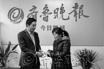 | 13日,万家装饰工程设计有限公司总经理孙洪卫将善款交给翟女士。 本报记者 邹俊美 摄 |