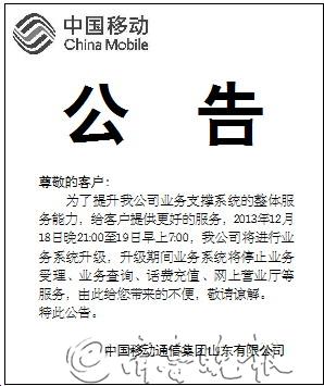 公 告 尊敬的客户: 为了提升我公司业务支撑系统的整体服务能力,给客户提供更好的服务,2013年12月18日晚21:00至19日早上7:00,我公司将进行业务系统升级,升级期间业务系统将停止业务受理、业务查询、话费充值、网上营业厅等服务,由此给您带来的不便,敬请谅解。 特此公告。 中国移动通信集团山东有限公司