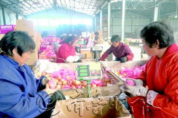 | 在栖霞一果品公司内,工作人员正在挑选苹果准备出口印度。 本报记者 李娜 摄 |