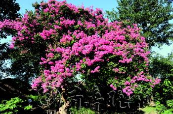 牟平区文化街道永安庄村西南的半山腰上,有一棵百年紫薇树,树高约5米,枝下高2.8米,冠幅东西5.4米、南北4.7米,传说树龄约230多年。该树树干光滑洁净,突筋露骨,扭曲向上,树姿优美,枝繁叶茂,宛若华盖。盛花时,花儿密密匝匝,挂满枝头,红似火焰,绚丽多彩,香飘数里。 紫薇树傍边,原有一座庙宇,称“法花寺”。相传,这棵紫薇树是当年所植。据《宁海州志》记载:“法花寺在州南十里,明宏治间代诏宫佩别业,后舍为寺观也。万历中庠生宫民望命僧义亨主之。”清末民国初年,因战乱引发火灾,庙宇被毁,仅遗留下这棵紫薇树。 紫薇树又称“百日红”、“痒痒树”。该树花期极长,由7月开至9月,繁花满树,花色艳丽,故有“百日红”之称,又有“盛夏绿遮眼,此花红满堂”的赞语。宋代诗人杨万里有诗赞颂:似痴如醉丽还佳,露压风欺分外斜。谁道花无红百日,紫薇长放半年花。明代薛蕙也有诗句:紫薇花最久,灿烂十旬期,夏日逾秋序,新花续放枝。“百日红”又叫“痒痒树”,只要人们用手在树干上一挠,或者轻轻抚摸一下,全树立即会枝摇叶动,浑身颤抖,甚至会发出微弱的“咯咯”响动声。因为它的枝叶太细,轻轻一碰,就会摇摆,就好像怕痒一样。这就是它“怕痒”的一种全身反应,实是令人称奇。 1985年,紫薇被烟台市政府确定为烟台市市花,全市百年以上的紫薇树仅有7株。永安庄村的这棵紫薇树,是烟台市树龄最大,树姿最美,开花最多,花色最艳的一棵。