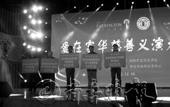本报12月16日讯(记者 丛书莹 实习生 于国琦)16日下午3点,潍坊市慈善总会在富化国际会议中心举办慈善义演大会。会上,爱心企业和个人纷纷献出爱心,一个半小时的义演共募集善款365万余元。 此场义演,节目均由潍坊市艺术剧院提供,据所有演员、工作人员不拿任何报酬。歌曲、舞蹈、戏曲、趣味诗朗诵等节目异彩纷呈。在慈善义演大会上,为潍坊慈善做出突出贡献的刘竹承先生作为代表发言,并再次奉献爱心,定点捐助贫困学生和潍坊市儿童福利院50万元。 现场,20多家爱心企业奉献爱心,参与了定点慈善冠名捐助,其中山东诺诚建设定点捐助临朐县九山镇教育园区建设资金100万元,潍柴集团定点捐助临朐县寺头镇河庄村村民卫生所、活动中心65万元,海王银河医药有限公司定点捐助诸城市18处敬老院价值50万元的药品。 另外,现场还举行了小额冠名慈善基金签约仪式,4位爱心人士设立了以自己名字命名的爱心基金。其中王亚芹设立1万元“亚芹助医基金”,杨金光设立1万元“金阳光助学基金”。富华的职工还举行了募捐,义演结束后,经统计,共收到善款365万余元。 潍坊市慈善总会专职副会长马全海表示,部分人生活十分困难,他们有的身有残疾,有的长年患病,有的突然遭遇灾害袭击,亟需社会伸出关爱和援助之手。办慈善义演,是想丰富慈善形式,努力帮助这些人走出生活困境。这些善款会根据企业和爱心人士的捐赠要求,送到受助者手中,并会给捐助者反馈。捐助者也可自行查询监督善款去向。 患先天脊柱侧弯 小茂祥急需救助 在慈善义演大会上,小茂祥作为受助代表上台发言。记者了解到,今年6岁的小茂祥患有先天脊柱侧弯,是安丘贾戈大汶村开发区人,出生时因为是早产儿,身体不好,为了能挽回孩子的生命,家里花去了20万元。 在茂祥长到2岁的时候,茂祥的父母发现孩子的脊柱侧弯越来越严重,急需手术。但是家里已经拿不出钱为孩子治病。2011年潍坊市慈善总会了解到这个情况后,将书画义卖活动筹集的10万元捐赠给茂祥。并为其联系了北京协和医院进行手术。茂祥在北京做了矫正手术,花去了8万元。现在茂祥每年还要进行两次的小手术,和三次的检查。每次手术要花去2万元,检查也要几千元。 据了解,茂祥的父母都是农民,为了多赚钱,孩子的父亲给人打工开大车,一个月才回家一次。母亲除了平时照顾茂祥外,只要有时间就去超市打短工。因为慈善总会有着不重复救助的规定,所以希望有爱心企业和爱心人士可以给予茂祥关注。如有捐助小茂祥的可以和潍坊市慈善总会联系,电话为8868817。 本报记者 丛书莹 实习生 于国琦