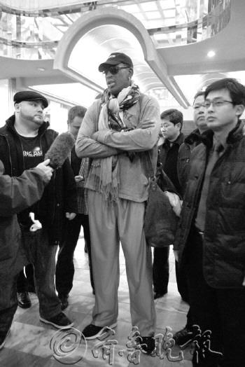 | 19日,罗德曼(中)在平壤的酒店接受记者采访。 新华/美联 |