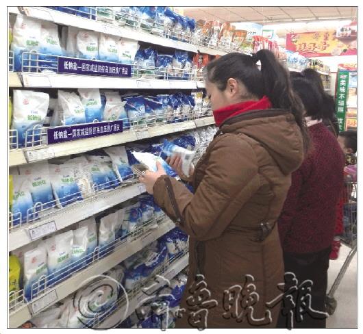 大图:市民都在选购盐。 小图:价格为2.9元的低钠盐。