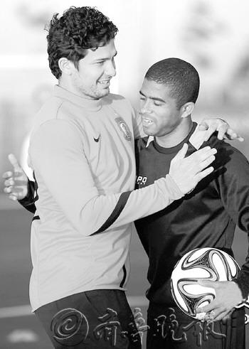 | 广州恒大与米内罗竞技训练时,恒大队中的巴西人埃尔克森碰到对手中的老熟人寒暄起来。 |