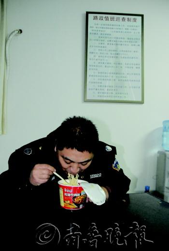 文/本报记者 罗静 片/本报记者 姜文洁 24日23时左右,刘子军处理完路上事故回到值班室,泡上一碗热腾腾的方便面吃起来。刘子军是青银高速淄博路政大队的一名普通工作人员,当晚正值平安夜,为了保障高速路行车平安和畅通,他和同事们仍然坚守在岗位上。 一起事故处理完马上奔赴下一个 24日20时07分,刘子军接到电话,K237济南方向有压车情况,不知原因。刘子军和他的搭档郝昱立即提上工具箱往外走。“这反光背心在值班时是时刻穿着的,一旦有情况可以马上上路,我们早到一会儿,高速路就能早一会儿畅通。” 一路上,刘子军和郝昱不时遇到有车辆占据应急车道的情况,刘子军就赶紧按警报。“有的车辆占据应急车道,一定程度上影响了赶去救援的速度。”一路疾驰后,终于到达了事发地点。只见一辆罐装车停在应急车道上,两个半米高的铁桶摆放在距车五六米远的地方,用作警示。刘子军下车后,先让驾驶员拿出车上的三角警示牌摆上。“在高速路上紧急停车后,要在距离停车地点后方150米远的地方摆上三角警示牌。”刘子军对货车司机说。经过了解,原是这辆罐装车在行驶中刹车打气用的气管断裂了,轮胎抱死,维修人员正在赶来的路上。处理完毕后,还没等上车,刘子军又接到了K257济南方向三车追尾事故的消息。刘子军和郝昱迅速上车赶往事故地点。因为怕耽误救援时间,刘子军给另一名值班队员打电话让其先赶过去处理。 23时左右,处理完事故的刘子军和郝昱回到了队上待命。 徒步一小时叫醒20公里车队 记者了解到,事故处理完后道路不能马上畅通。“夜里高速路上一般都是大车。一旦遇到交通事故,堵车了。大车司机开车都很累了,一般他们都把车停下、熄火,然后就睡觉了。即使是两个驾驶员也是都睡觉。我们处理完事故后还要挨着把他们叫醒。他们都睡得很沉,用警报都叫不起来,得拍车门才叫得醒。” 据介绍,一周前,刘子军值班的时候,凌晨发生了一起交通事故,大约凌晨1点就处理完事故了。因为大车司机都睡着了,刘子军和他的同事只能开着车一路对司机提供“叫醒服务”。这近20公里的车队,刘子军和他的同事用了近一个小时才全部把司机叫醒。“不叫醒不行啊,一是影响高速路的通畅;二是随便停在路上太危险了,又熄火了,没有灯光,很容易发生车祸。我们必须得把司机们都叫醒。”
