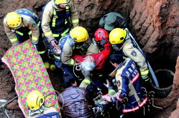 26日清晨,在济南历城区唐王镇段家村,一名六旬老太被发现卡在一口水井中,命悬一线。当地消防接警后与附近群众一起,将水井一截截挖开,历时6小时终将老太救出。 本报记者 戴伟 摄