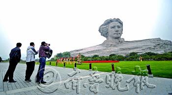 | 26日,几位参观者在湖南长沙橘子洲青年毛泽东雕像前参观拍照。 新华社发