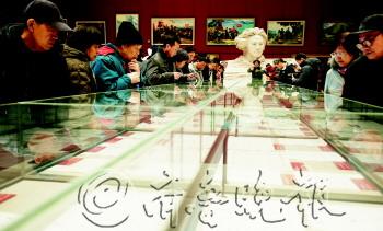 | 26日,观众在北京国家博物馆参观毛泽东书法与当代名家雕塑绘画展中展出的毛泽东书法作品。 新华社发