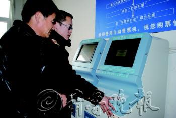 | ◤车站工作人员教一旅客使用自动取票机取票。本报记者 崔如坤 摄 |