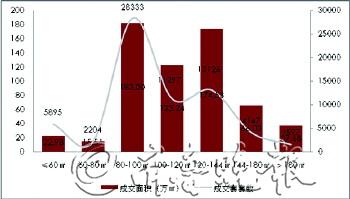 2013年,济南市商品住宅成交面积以80-100□和120-144□为主,两个区间成交总量占比高达57%。目前济南市商品住宅市场是以刚性需求和改善性需求为主导的,对于80-100□的二室户型和120-144□的三室户型较为青睐,100-120□的小三室也逐步赢得市场地位。