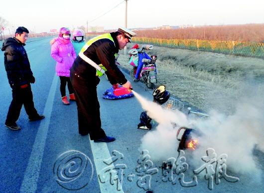 24日,沾化县刘女士骑电动车正常行驶时,后车座突然冒起浓烟,随后自燃。幸好有路人提醒,刘女士及时发现。执勤民警赶到后将火扑灭,起火原因可能是由于电源线路发生故障引起。